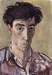 From 1943 to 1946 Minton taught illustration at the Camberwell College of Arts, and from 1946 to 1948 he was in charge of drawing and illustration at the Central School of Art and Design.[6] At the same time he continued to draw and paint, sharing a studio for some years with Robert Colquhoun and Robert MacBryde, and later with Keith Vaughan.[1] Reviewing a 1944 exhibition, The Times remarked that Minton was clearly in the tradition of Samuel Palmer,[7] something frequently remarked on by later critics.[1][6] Minton's output was considerable. Between 1945 and 1956 he had seven solo exhibitions at the Lefevre Gallery, notwithstanding his work as tutor to the painting school of the Royal College of Art in 1949, a post that he held until the year before his death.[6] Minton's appearance in this period is shown in a 1952 portrait by Lucian Freud,[8] as well as in self-portraits. In the 1940s he, Freud and fellow artist Adrian Ryan had been in a homosexual love triangle.[9]