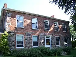 It is an example of Georgian architecture, a two-storey structure of stone and brick, it features a symmetrical five bay front façade with a central door and two sets of flanking windows on the main floor, and five on the second storey.