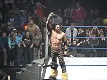 On April 26, Morrison was drafted to the Raw brand as part of the 2010 WWE draft, and lost his first match back for the brand later that night to Jack Swagger.[103] In his final match on SmackDown, he lost to Cody Rhodes.[104] On June 1, Morrison announced that he would be mentoring Eli Cottonwood in the second season of NXT.[105][106] Cottonwood, however, was the second person eliminated from the competition, and was eliminated on the July 27 episode of NXT.[107] Morrison then went on to participate in the main event of SummerSlam on August 15, in which he and six teammates (John Cena, Edge, Chris Jericho, Bret Hart, R-Truth, and Daniel Bryan) were victorious in a seven-on-seven elimination tag team match against The Nexus.[108] In October, Morrison began a feud with Sheamus after he helped Santino Marella earn an upset win during a one-sided match against Sheamus. Within the following weeks, Morrison continued to save Marella from attacks by Sheamus. At Survivor Series on November 21, Morrison defeated Sheamus.[109] Morrison entered the 2010 edition of the King of the Ring tournament, defeating Tyson Kidd, Cody Rhodes, and Alberto Del Rio but lost to Sheamus in the final round.[110][111] He continued to feud with Sheamus and defeated him in a WWE Championship number one contender's ladder match at Tables, Ladders & Chairs on December 19.[112] Morrison received his WWE Championship match on the January 3, 2011 episode of Raw, but lost to reigning champion The Miz in a falls count anywhere match.[113] Morrison participated in the Royal Rumble match at Royal Rumble on January 30, 2011 and despite not winning, he had a stand-out moment which was praised by critics as "arguably the spot of the decade" when Morrison was knocked off of the ring apron and performed a cat leap onto the barricade to avoid having his feet touch the floor and then went on to precision jump onto the ring steps and re-enter the ring.[114] On February 20, Morrison participated in the Elimination Chamber match at Elimination Chamber, but was eliminated by CM Punk.[115] During the match, Morrison climbed to the top of the cage while inside the cage before dropping to deliver a crossbody on and eliminate Sheamus.[116][117] At WrestleMania XXVII on April 3, Morrison, Trish Stratus and Jersey Shore guest star Snooki defeated Dolph Ziggler and LayCool (Layla and Michelle McCool) in a mixed tag team match.[118]