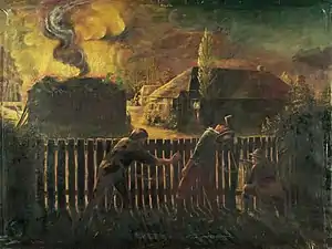 With the light increasing as the barn burned, it was observed that the bushrangers were crouched in a field of oats behind a paling fence about forty yards from the front of the house. Amelia Campbell drew her husband's attention to a man in a cabbage-tree hat, looking over the fence in the direction of the burning barn. Campbell ran to the end of the house, and from the front corner, took deliberate aim at Jack O'Meally, the man in the cabbage-tree hat, and fired his gun. While Campbell reloaded, several shots were fired but it appeared to him the bushrangers were retreating.[103] Before leaving the station, the bushrangers retreated to one of the huts, where a female servant heard them "cursing and swearing in a most fearful manner that they would have their revenge". In a letter to her mother after the events of that night, Amelia Campbell disclosed that the servant "heard one of them regretting not having shot the woman, – meaning, I suppose, myself, – but his comrade called out to him to hold his tongue, and mind what he was about".[105]