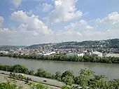 This land stretched from the present-day Smithfield Street Bridge to Becks Run Road along the Monongahela River; Ormsby called it Homestead Farms.[7][8] In 1773, Ormsby received a license to operate a ferry across the Monongahela River, which connected Pittsburgh with his estates in what is now called the South Side. He operated this ferry, the first in Pittsburgh, until he sold it in 1789.[9] He also established a brickyard and boatyard near his estate.[10] This ferry was later operated by John Patch and served as a contributor to the development and culture of the area in centuries following.[11]