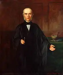 In Birmingham Postgate was shocked by the state of general pollution. No fewer than 176 industrial chimneys were spewing smoke into the air and the streets were "running sewers"; he published his first reformist pamphlet, on the "sanatary aspects" of the town calling for municipal action.[3] But unfortunate experiences with his patients drew his attention to food and drug adulteration, which became the major preoccupation of his life. He was aware of the earlier campaign against food adulteration by Thomas Wakley and Arthur Hill Hassall publicised through The Lancet;[4] but he considered that publicity alone was inadequate, and only political action would lead to legislation. He organised a meeting on food adulteration for the scientific and medical community of Birmingham, but his major success was to interest the Birmingham Members of Parliament William Scholefield and George Frederick Muntz in the issue.[5] Postgate suggested that a system of public analysts be set up charged with monitoring samples of food and drugs, supported by magisterial powers to levy fines on fraudsters. As a preliminary step, Scholefield moved on 26 June 1855 for a Select Committee of Inquiry in the House of Commons, and this was duly agreed.