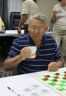 A competitive checkers player,[10] Webster won the United States Blitz Go-As-You-Please Championship at the American Checker Federation National Championship in Medina, Ohio on July 25, 2011.[5][6] He also won the North Carolina State Checkers Open in Greensboro, North Carolina on May 18, 2011, and the Southern Open in Lebanon, Tennessee on July 10, 2011.[6] He was a silver medalist at the West Tennessee Strawberry Festival Open on 7 May 2011 in Humboldt, Tennessee.[5] In October 2011 he competed in San Remo, Italy at the World Qualifier Checkers Tournament.[5] Webster began playing checkers when he was ten years old at country general stores. He traveled to play in Reidsville, Danville, Draper, Burlington, and Winston-Salem through the YMCA's Chess & Checkers Association.[5][7] His first North Carolina State tournament, when he was sixteen years old, was in Hickory in 1958.[5] He has won the North Carolina checkers championship eleven times.[5][9] He also acted as an early checkers mentor for his nephew and competitive checkers player, Jeff.[11]