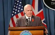 Reid took an aggressive approach to defending his government's international policy. Speaking ahead of a conference on NATO modernisation in Germany on 4 February 2006, Reid asserted in a press interview that "no institution has the divine right to exist".[55] Similarly on 19 March 2006, in response to former interim Iraqi prime minister Iyad Allawi's claim that Iraq is in the grip of civil war, Reid defended the British Government's contrary view. He stated: "Every single politician I have met here [in Iraq] from the prime minister to the president, the defence minister and indeed Iyad Allawi himself said to me there's an increase in the sectarian killing, but there's not a civil war and we will not allow a civil war to develop".[56]
