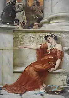 Weguelin's most famous painting is probably Lesbia (1878),[3] inspired by the woman who inspired many of the Roman poet Catullus' works. Catullus used the pseudonym "Lesbia" to refer to an aristocratic lover whom he did not wish to scandalize, although their relationship was tumultuous, and Catullus writes bitterly of its ending. She is widely supposed to have been Clodia, around whom swirled rumors and scandals involving some of the most prominent men at Rome, although no contemporary source makes that identification, and this element of mystery adds to the appeal of both the poems and Weguelin's painting.