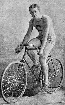 Johnson was the first to bicycle 1-mile in less than two minutes, or 1:56.6. This happened in 1892 at a racing track in Independence, Iowa.[2] Besides racing on the track, early in his career he also competed in road races.[3] Johnson was also a world record holder in speed skating, and won world championship titles in both sports. Later in his career, Johnson rode for racing teams sponsored by the bicycle manufacturers E.C. Stearns Bicycle Agency of Syracuse, N.Y., and Schwinn Bicycle Co. of Chicago. He retired from competitive cycling in 1900. He died January 17, 1934, in Minneapolis, Minnesota.[4] He is buried in Lakewood Cemetery, Minneapolis.