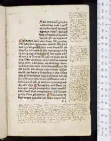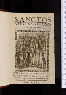 Beyond manuscripts, the Selden collection contains several notable printed works. Among them is the first book ever printed in Japan using moveable type, Sanctos no gosagueo no uchi nuqigaqi (Arch.b.f.69).[42] The printed books included in the Selden collection contain many that are significant in part because they originated in the libraries of other famous figures, including Sir Robert Cotton, John Donne, and John Dee.[42] According to Geoffrey Keynes, several of the books Selden received from John Donne's library include inscriptions from both men. One such book is Theodorus Beza's Tractatio de polygamia, which includes Donne's signature and motto ("Per Rachel ho servitor, & non per Lea"), as well as Selden's motto ("περί παντός τήν έλευθερίαν", "Freedom above all things").[48][49]