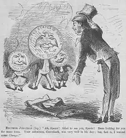 In the next Congress, among the first bills to pass the house was the Public Credit Act of 1869, which would require the government to pay bondholders in gold, not greenbacks.[95] The 1868 election campaign had seen the Democrats proposing to repay the bondholders (mostly supporters of the Union war effort) in paper; Republicans favored gold, as the bonds had been purchased with gold.[95] Sherman agreed with his fellow Republicans and voted with them to pass the bill 42-13.[96] Sherman continued to favor wider circulation of the greenback when he voted for the Currency Act of 1870, which authorized an additional $54 million in United States Notes.[95] Sherman was also involved in debate over the Funding Act of 1870. The Funding Act, which Sherman called "[t]he most important financial measure of that Congress," refunded the national debt.[97] The bill as Sherman wrote it authorized $1.2 billion of low-interest rate bonds to be used to purchase the high-rate bonds issued during the war, to take advantage of the lower borrowing costs brought about by the peace and security that followed the Union victory.[97] The Act was the subject of considerable debate over the exact rates and amounts, but once the differences were ironed out, it passed by large majorities in both houses.[97] While Sherman was unhappy with the compromises (especially the extension of the bonds' term to 30 years, which he believed too long), he saw the bill as an improvement over the existing conditions and urged its passage.[97]