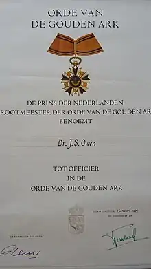 In 1955 Owen was awarded the OBE for his campaigning work on pensions for ex-colonial officers. In 1971 he was made an Honorary Doctor of Science at Oxford University for his contribution to conservation, and in the same year, he was awarded the World Wildlife Fund Gold Medal.[10] In 1975 he was awarded the Order of the Golden Arc by Prince Bernhard of the Netherlands, the inaugural president of the World Wildlife Fund.[11]