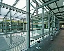 The library is the only "modern"-style building on campus, while the other buildings are of Mission Revival and Spanish Colonial Revival architecture. It features a naturally lit "buffer zone", which separates existing and new structures. The surrounding environment is showcased in 360-degree views. It consists of two separate pieces: the physical structure itself and the canopy above, which extends from the plaza over the library and is anchored to the foundation through eight steel posts visible in the Reading Room. The Reading Room features a thermally insulated glass canopy. In the plaza, the canopy is louvered, thus filtering light through the plaza, while not allowing the sun to make direct contact with the book stacks. The stacks are visible from any vantage point. Just outside the main doors is the Reflection Pool. The library serves as a direct axis point through campus, both north & south and east & west.[3]