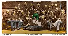 His work as a composer was much esteemed during his lifetime but is not well known today - and Stainer himself was dismissive of his own work, telling Edmund Fellowes that "he regretted ever having published most of his compositions".[33] The Crucifixion is one of the few major works of his that is still regularly performed. It is often given in Anglican churches during Holy Week and forms part of the repertoire of numerous choirs. He also made a lasting contribution to the music of Christmas in his Christmas Carols New and Old (1871), produced in collaboration with the Revd. H. R. Bramley, which marked an important stage in the revival of the Christmas carol. The book includes Stainer's arrangements of what were to become the standard versions of "What Child Is This", "God Rest Ye Merry Gentlemen", "Good King Wenceslas", "The First Nowell", and "I Saw Three Ships", among others.[34] He was a skilled musician and accompanist and Walter Galpin Alcock, who was taught composition by Arthur Sullivan at the National Training School for Music, recalls Sullivan saying "I was at St Paul's yesterday, listening to Dr Stainer extemporising. My dear young friends, he is a genius, and I hope you will miss no chance of hearing him."[35] John Stainer was also a close friend of Edmund Hart Turpin, the later Hon. Secr. of the Royal College of Organists for more than fifty years.[36]