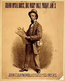 John T. Raymond (1836-1887), whose original name was John O'Brien, was an American stage actor, born in Buffalo, New York, on August 5, 1836; he died in Evansville, Indiana on April 10, 1887. His first appearance was made on June 27, 1853, at a theatre in Rochester, New York, under the management of Messrs., Carr and Henry Warren, as Lopez, in "The Honeymoon." Afterwards, he went to Philadelphia, Baltimore, Charleston, Savannah, Mobile and New Orleans. In 1858 he had his early success with Sothern in Tom Taylor's Our American Cousin, in which he later appeared in London and in Paris. Raymond first became known in New York in 1861, when he appeared at Laura Keene's Theatre, succeeding Joseph Jefferson in low comedy parts, and at that time he acted Asa Trenchard in "Our American Cousin." His greatest popular hit was as Col. Mulberry Sellers in a dramatization of Mark Twain's Gilded Age' (1873), a character that became completely identified with his own breezy optimism. Raymond's professional career extended over a period of thirty-two years, in the course of which he acted in all the parts that usually fall to the lot of a low comedian.
