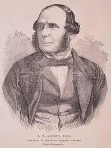 He played a part in establishing the Royal Dramatic College, a retirement home for actors: this ambitious project, which originated in 1858, was supported by Charles Dickens and William Makepeace Thackeray. In 1860, land was purchased from the London Necropolis Company in Woking for the building, and the college was opened a few years later. Anson was Secretary of the college. By 1870 the college was in need of funds, and later closed; the building was sold in 1884.[1][6][7][8]