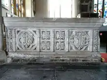 John Waldron (died 18 July 1579) of Tiverton in Devon, England, was a wealthy merchant[1] who founded and endowed the surviving grade II* listed[2] "Waldron's Almshouses" and Chapel on the outskirts of Tiverton. His elaborately sculpted chest tomb survives in St Peter's Church, Tiverton, at the east end of the south aisle, still in an entirely Gothic style[3] (long after the Renaissance style entered England) with a Gothic black-letter inscription on the ledger stone on top, and showing on the base Gothic pinnacled niches and within quatrefoils escutcheons displaying his merchant's mark. His name is sometimes confused with "Walrond" a prominent and ancient gentry family long seated at Bradfield House in the parish of Uffculme, Devon, about 6 miles east of Tiverton. The spelling "Waldron" is clearly shown incised in Gothic letters on the ledger stone on top of his chest tomb.