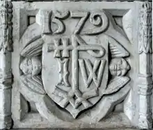 The chapel occupies the western part of the building. It has a projecting porch to the west with a moulded doorway with carved spandrels. The porch is surmounted by a stone parapet, profusely decorated with relief sculpture, including ships and elephants, indicating Waldron's membership of the Guinea Company and his involvement in the Ivory trade.[14]
