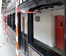 The Almshouse was built in open fields on the outskirts of the town of Tiverton, near the "Wellbrook" stream.[14] The town has since greatly expanded to surround the site, and "Wellbrook Street" now runs past the Almshouses. A large modern complex of charitable housing was built in the 20th century to the rear of the Almshouses by the "Tiverton Almshouse Trust".[14] The two-storey Almshouse occupies the eastern part of the building and was designed for 8 "poor, impotent and indigent"[14] men of Tiverton, each occupying a single room.[15] The upper floor is reached by an external staircase leading to a covered gallery landing. In 1847 they were in "a most dilapidated state", as described by Harding in his History of Tiverton.[16] They were restored in 1987,[15] as is recorded on a plaque inscribed: