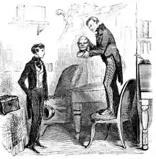John Wemmick is a fictional character in Charles Dickens's novel Great Expectations. He is Mr Jaggers's clerk and the protagonist Pip's friend.[1] Some scholars consider him to be the "most modern man in the book".[2][3] Additionally, Wemmick is noted as one of Dickens's "most successful" split characters, insofar as Wemmick's character represents an exploration of the "relationship between public and private spheres in a divided existence".[4]