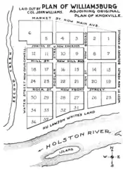 In 1816, Williams made plans to develop a subdivision, "Williamsburg," on what was then the outskirts of Knoxville (now part of the Downtown area). This subdivision was bounded by what is now Henley Street (which at the time was the city's western boundary), Main Street, the riverfront, and Second Creek.[4] The area is now occupied by Maplehurst Park and the Church Street Methodist Church.