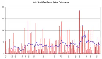 Wright typically opened the batting for New Zealand, and was noted as a tenacious, rather than spectacular, batsman. His team nickname was "shake"; reputedly a reflection on his packing technique. Together with Bruce Edgar of Wellington, he formed what was arguably New Zealand's most successful and reliable opening partnership. During a match against Australia in 1980, he became the second player in history to score an eight off one ball in a Test, running four and collecting four overthrows.[5] Toward the end of his career he used an unorthodox batting stance; whereas most batsman face the bowler with the bat in line with their legs and perpendicular to the ground, Wright would stand with his bat raised parallel to the ground.