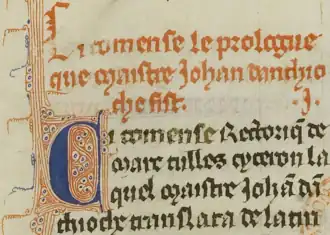 At the request of fellow Hospitaller William of Santo Stefano,[lower-alpha 1] John translated Cicero's De inventione and the anonymous Rhetorica ad Herennium. At the time these works were considered two parts of a singular work of Cicero's on rhetoric. John's translation thus came under the title Rectorique de Marc Tulles Cyceron.[lower-alpha 2] It was completed at Acre in 1282.[lower-alpha 3] The manuscript presented to William—now Chantilly, Musée Condé, MS fr. 433 (590)—also contains a preface, an epilogue on the methodology of translation and a treatise on logic. These parts may also have been completed at Acre in 1282 or perhaps a little later in Cyprus.[8] The preface and the treatise on logic are in a different hand from the rest of the manuscript,[8] which is probably in John's hand.[4][9] The epilogue was written by John (and thus probably at Acre in 1282). The treatise on logic consists of excerpts from Boethius' De topicis differentiis, most likely translated but probably not selected by John.[8][10]