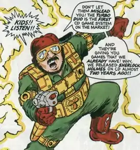 Johnny Turbo and his partner Tony were pitted against monsters or androids from a company called "FEKA" (a thinly veiled parody of Sega), which, in the comics, misled children into wasting their money on their CD add-on system (a thinly veiled parody of the Sega CD).[5]