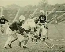 The following year, Maryland was again named the top-seed, despite having lost to second-seed Johns Hopkins during the regular season. In the championship game, Hopkins quickly took the lead, led by Hall of Fame attackman Jack Thomas[25] and entered halftime with a 10–4 advantage. In the second half, Maryland outscored them 8–7, but the effort fell short. In 1975, Maryland defeated Hopkins, 19–11, before winning the national title, and won again the following year, 21–13, on their way to finish as national championship runners-up after an overtime loss to Cornell in the final. In 1977, the Blue Jays edged the Terrapins, 21–20, in the regular season and began a run in the series. Hopkins eliminated Maryland in the tournament semifinals in both 1977 and 1978, before beating them in the 1979 championship game at home in College Park, Maryland.[16] During that game, the Blue Jays were able to limit the Terrapins' second all-time leading scorer and 1979 attackman of the year Bob Boneillo.[26] During the 1970s, Maryland participated in six NCAA title games, including four in a row from 1973 to 1976. During that span, the Terps won two national titles and lost four.[27]