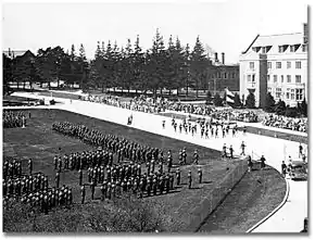 This is a picture taken in the 1930s of the Canadian Forces training on Johnston Green, right in front of Johnston Hall, the old building