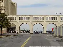Arkham State Hospital is based on Arkham Asylum.[36] Warner Bros. Korea explained that it is a more realistic name in the real world.[110] The exterior of Arkham State hospital was filmed at Brooklyn Army Terminal,[111] while the interior was pictured in Metropolitan Hospital Center of Harlem.[112] Throughout the film, two walls are shown inside Arkham State Hospital; one is clearly white in the first and last scenes, the other is dirty yellow in the scene in which Arthur runs with a medical report. This difference was intended to make the audience confused and to question the possibility that Arthur had been in hospital the entire time.[36][110]