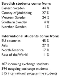 According to the Sweden Higher Education Authority, an institution that provides information in regards to the quality of the different study programs offered by Swedish universities, JIBS is home to the top five study programs in international exchange in Sweden.[5] Out of the economics students 60% pursue a semester abroad and the current student body comprises students from 32 countries and one third of the faculty is drawn from outside Scandinavia.