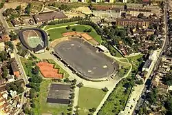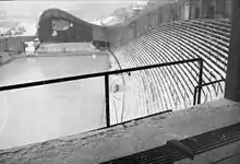 The use of artificial ice was at the time not obligatory for Olympic ice competitions. It had only been used once before, at the 1936 Winter Olympics. The city had several incentives for building an artificial rink. In addition to the post-Olympic value of having a quality venue, the committee would not have to designated an out-of-town reserve venue, should there be fair weather during the Olympics.[5] Several locations were considered. The main Jordal proponent was Labor-politician Rolf Hofmo, who was instrumental in deciding on the location,[6] which was at the site of a former brickyard, hence the dug-out hill location. This was also the location of Jordal Stadion, a local stadium built between 1930 and 1936.[7]