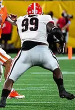 Davis played in 11 games with four starts as a true freshman, recording 25 tackles with 1.5 sacks and was named to the SEC All-Freshman team and a Freshman All-American by the Football Writers Association of America.[3][4][5] As a sophomore, he had 18 tackles, 4.5 tackles for loss and 2.5 sacks.[6][7] During the COVID-19 shortened 2020 season, Davis had 16 tackles and a sack while leading his team to a win in the 2021 Peach Bowl over Cincinnati.[8][9][10] Davis had his best season as a senior with 32 tackles (17 solo), two sacks, one pass defended, and a rushing touchdown.[8][11] After completing a perfect regular season, Davis and the Bulldogs fell to the Alabama Crimson Tide in the 2021 SEC Championship 41–24.[12] Despite their loss, Georgia was ranked as the third seed in the 2021 College Football Playoffs. They went on to defeat the second-ranked Michigan Wolverines in the 2021 Orange Bowl, creating a rematch against Alabama in the 2022 College Football Playoff National Championship.[13] Georgia defeated Alabama in the National Championship 33–18, claiming their first national championship since 1980.[14] Davis earned Consensus All-American honors for the 2021 season.[15] He won the Chuck Bednarik Award and the John Outland Trophy.[16][17]