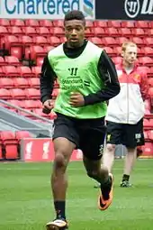 For the 2013–14 season, Ibe was allocated the number 33 shirt vacated by Jonjo Shelvey.[14] He made his first start of the season on 27 August, playing 120 minutes as Liverpool beat Notts County 4–2 after extra time in the League Cup second round.[15] On 8 February 2014, he made his second Premier League appearance, as a 76th-minute substitute in a 5–1 home win over Arsenal.[16][2]