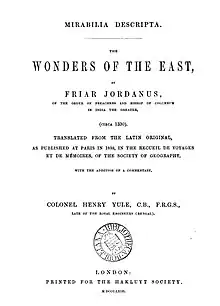 - Jordanus, Catalani; Yule, Henry; Parr, Charles McKew donor; Parr, Ruth (1863). Mirabilia descripta : the wonders of the East. London : Printed for the Hakluyt Society. p. 23.