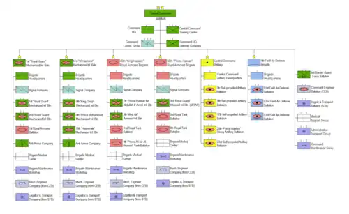The Central Command was created after a major army reorganization in 1977. The units that make up the command were transferred from the former 4th Mechanized Division which was disbanded. The units of the command are currently deployed from Zarqa River, north of as-Salt to the Dead Sea in order to protect Jordan on its Israeli border.[1] In 2000 King Abdullah II initiated further restructuring of Jordanian Armed Forces when the remaining Divisions were transformed into lighter, more mobile forces, based largely on a brigade structure and considered better capable of rapid reaction in emergencies.[2][3]