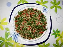 | Tabbouleh (تبولة) | Vegetarian dish traditionally made of tomatoes, finely chopped parsley, mint, bulgur and onion, and seasoned with olive oil, lemon juice, and salt. Some variations add garlic or lettuce, or use couscous instead of bulgur. |