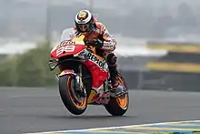 His first victory of the season came during a wet race at Aragon, his first win at the circuit.[60] Lorenzo followed that victory up with a victory in the next race at Motegi,[61] having also won at the circuit in 2009 and 2013.[62] For the majority of the season, Lorenzo was involved in a three-way rivalry with teammate Rossi and Dani Pedrosa to claim the runner-up position overall. At Valencia, Lorenzo took the decision to swap bikes – on lap 20 – as light rain fell. He struggled to get the bike stopped in the uncertain conditions and dropped down the order; he ultimately retired from the race.[63] He finished third in the final championship standings behind Márquez and Rossi, with 263 points.[64]