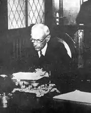 On 10 September 1930, Uriburu was recognized as President of the Nation by means of an infamous and controversial ruling by the Supreme Court, which gave rise to the De facto government doctrine.[13] This doctrine legitimized the new government, "as long as it executes the administrative and political function derived from its possession of the force as guarantee of order and social security."[14] He dissolved the National Congress, declared a state of siege, replaced the governors of the provinces with radical governors through federal intervention, and attempted to establish a neo-corporatist government. In this system of government, similar to fascism, Uriburu saw an example of peace and political order.[15] On 18 September 1930, the ambassadors from the United States and England (a country Uriburu had served as an attaché), recognized his provisional government.