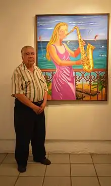He has created over 300 paintings.[8] His works can be found in the General Motors de México Collection, the Museo de Mechoacanejo in Jalisco, the Arte del Club and the Galería de Arte and Libros in Monterrey.[1] Works appear on back covers of Reader's Digest in Mexico and Puerto Rico in the 1980s.[9] His work also appears on a series of covers of the programs for performances of the Orquesta de Nuevo Mundo from 1998 to 2002.[10]