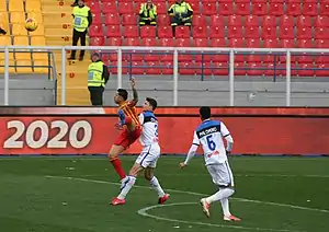 At the start of the 2018–19 season, Palomino played in both legs against FK Sarajevo in the second round of the UEFA Europa League and scored in the second leg, as Atalanta won 10–2 on aggregate to progress to the next round.[79] However, he suffered a minor knock that saw him miss two matches.[80] Upon returning to the first team from injury against Roma on 27 August 2018, Palomino was given the captaincy in the absence of Papu Gómez, who was on the substitute bench, and helped the club draw 3–3.[81] He then regained his first team place, playing in the centre–back position despite suffering from a minor knock along the way.[82] Palomino then scored his first goal of the season, in a 3–0 win against Parma on 27 October 2018.[83] However, in a match against Genoa on 22 December 2018, he was sent off for a second bookable offense, as Atalanta lost 3–1.[84] After serving a one match suspension, Palomino returned to the starting line–up against Sassuolo on 26 December 2018 and set up the club's third goal of the game, in a 6–2 win.[85] Since returning from suspension, he continued to regain his first team place, playing in the centre–back position, for the rest of the 2018–19 season.[86] Palomino played in both legs of the semi–final of the Coppa Italia against Fiorentina, as he helped the club win 5–4 to reach the final.[87] However, in the Coppa Italia Final against Lazio, he started the whole game, as they lost 2–0.[88] After serving a one match suspension, Palomino returned to the starting line–up against Sassuolo in the last game of the season and helped Atalanta win 3–1; with this result, Atalanta achieved a third-place finish in the league, qualifying to the 2019–20 UEFA Champions League group stage for the first time in their history.[89] At the end of the 2018–19 season, he went on to make 39 appearances and scored twice in all competitions.