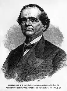 Juarez enlisted Carbajal as general of the Liberal forces.[95] On November 12, 1864, Juarez authorized Carbajal to enlist upwards of ten thousand foreign citizens.[96] Juan Cortina had been in control of Matamoros, and surrendered the city to the French, under the control of Tomas Mejia.[97] President Abraham Lincoln and Secretary of War Edwin M. Stanton sent General Lew Wallace on a covert operation to assist Carbajal in procurement of arms and ammunition.[98][99] In 1866, Napoleon III withdrew his troops from Mexico.[100][101] Mejia surrendered Matamoros to Carbajal, who was by then Governor and Military Commandant of Tamaulipas.[102] Seizures of churches from French clerics, and forced loans from French-leaning merchants were part of Carbajal's operations.[103] Sebastián Lerdo de Tejada appointed Santiago Tapia[104] to replace Carbajal. The military garrison of Matamoros also rebelled against Carbajal.[105]