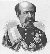 Promoted to capitán and decorated,[69] in the spring of 1874 Orbe was to organize the journey of his queen from Pau to the Carlist capital of Estella.[70] He designed the plan which involved travelling by train, by coach and accompanying camouflage activities, intended to deceive the French;[71] it all worked out and in the summer via Dancharinea Doña Margarita made it to Estella.[72] During the fall of 1874 he was assigned to combat operations in Gipuzkoa, mostly boiling down to failed sieges of Irún and Guetaria. Back in Navarre in early 1875, he took part in the February battle of Lacár. Promoted to comandante and decorated again[73] in the summer of 1875 he accompanied Carlos VII during Jura de Los Fueros in Guernica.[74] From that moment Orbe stayed within his personal escort and is not noted as engaged in frontline combat. Accompanying the claimant to the French frontier, in February 1876 he was promoted to lieutenant colonel[75] and awarded with vizcondado,[76] In Valcarlos Orbe crossed the border bridge with the claimant and decided to join him into exile.