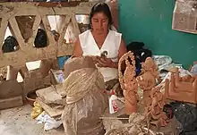 Josefina Aguilar (born 1945) is a Mexican folk artist from Ocotlán de Morelos, Oaxaca.[1] A member of the Aguilar family, she is best known for her small clay figurines called muñecas (dolls), an artform she learned from her mother.[2][3] Aguilar uses red clay to create depictions of everyday village activities, religious and folkloric scenes, famous figures,[4] and special Day of the Dead statues.[5] Collectors of her work include Nelson Rockefeller, who discovered her work on a trip to Oaxaca in 1975,[6] as well as repeat visitors to Oaxaca who come to see her latest work.[5][7] Aguilar says each figurine she makes is unique.[8] She became blind in 2014 and now uses touch to create her art.[9] One of her major collectors quoted her as saying "It's not the eyes. It's the hand and the brain."[10]