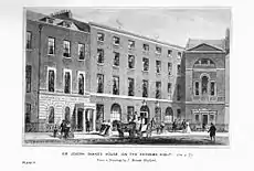 In March 1779, Banks married Dorothea Hugessen, daughter of W. W. Hugessen, and settled in a large house at 32 Soho Square.[17] It continued to be his London residence for the remainder of his life. There, he welcomed the scientists, students, and authors of his period, and many distinguished foreign visitors. His sister Sarah Sophia Banks lived in the house with Banks and his wife. He had as librarian and curator of his collections Solander, Jonas Carlsson Dryander, and Robert Brown in succession.