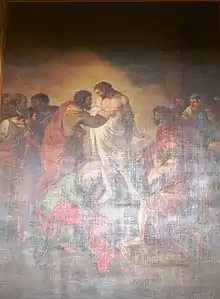 Barney returned to Wolverhampton in about 1779, as in August 1779 he married Jane Whiston Chambers (or Chandler) at St John's chapel, Wolverhampton.[6] In October 1780, their first child was born. It was imperative to obtain means to support his new family. No later than in November 1779 he started to collaborate with Matthew Boulton (1728–1809) and his Soho manufactory, assisting in the production of so-called mechanical paintings.[7] His duties were to touch and finish in paint images of original paintings which were mechanically reproduced on paper or canvas. He worked on paintings after Sir Joshua Reynolds, Benjamin West, Joseph Wright of Derby, Antonio Zucchi and Angelica Kauffman.[7] All paintings associated with Joseph Barney from the Soho period, be it mechanical or original, are figurative. Many of them, like Benjamin West's and Angelica Kauffman's works, are complex many-figures compositions.