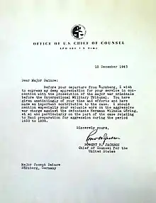 Before Major Dainow left Nuremberg, he received a personalized letter from Robert H. Jackson thanking him for his "important contribution to the case".