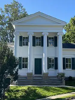Built circa 1848 by pioneer lumberman Joseph Hall, this structure is thought to be the oldest surviving residence in the town, and is considered one of the few superb examples of the Greek Revival "temple with wings" style to still exist in mid-western and north-central Pennsylvania. The facade features a two-story portico with four fluted Ionic order columns that were constructed of solid trees and a classical pediment (similar to the north facade of the White House).