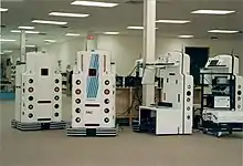 Four Helpmate robots on the floor of Transitions Research Corporation in Danbury, 1993