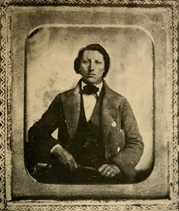 At the age of fifteen, Smith was called to go on his first LDS mission to the Sandwich Islands under the direction of apostle Parley P. Pratt. This mission assignment at an unusually young age happened after Smith assaulted a teacher who he felt was unfairly punishing another student; decades later Smith wrote in the LDS publication Improvement Era of the burning rage and explosive temper of his youth which he blamed in part on his reaction to the deaths of his parents.[3] Smith was ordained an elder by George A. Smith on April 24, 1854, and received his endowment at the Endowment House the same day. He then traveled to San Bernardino, California, where he worked to earn money for passage on a ship to San Francisco. In the San Francisco area, possibly in what is now Fremont, California, on the farm of John Horner, he was again employed in agricultural pursuits seeking to earn money for passage to Hawaii.[4][5]