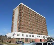 The apartments cost $1,626,000 when it was built, starting in 1950.[1] The ground floor was supposed to have space for commercial spaces, and the second floor was to have professional offices such as lawyers or doctors along with 156 apartments. Rent for an apartment ranged from $75 per month for a one-bedroom efficiency to $175 a month for one of three three-bedroom penthouse apartments. The property had been bought by Mr. Leonard D. Long in 1933 when it housed a tent community and there were only two nearby houses. Immediately before the construction began in January 1950, the site was home to a World War II-era nightclub known as the Windmill which was being used as a grocery store. The apartments were meant to cater to single men and women and retirees.[2]