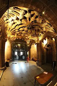 Around 1900 the Scots architect Robert Lorimer was commissioned to design various chimneypieces for the South Kensington Museum in London. Through this connection he encountered Hayes who had been working on the 1899 extension known as the Aston Webb building. He was impressed with Hayes' work and enticed him to go to Edinburgh with him to work on the Thistle Chapel - a project a decade in the making.[2] The Thistle Chapel sits in the south-east corner of St Giles Cathedral. Although of 20th century creation, it is of medieval form with complex fan vaulting and highly ornate carving, and was to house the ceremony linked to the creation of Knights of the Thistle.[3]